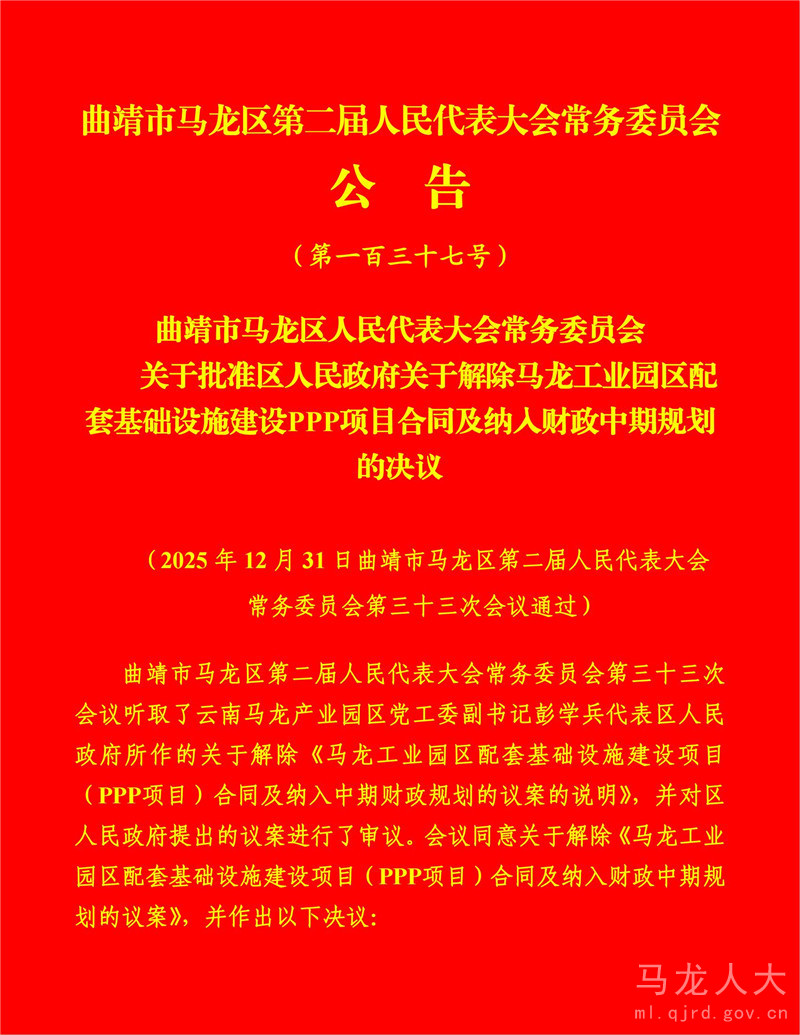 曲靖市马龙区第二届人民代表大会常务委员会公告(第一百三十七号)