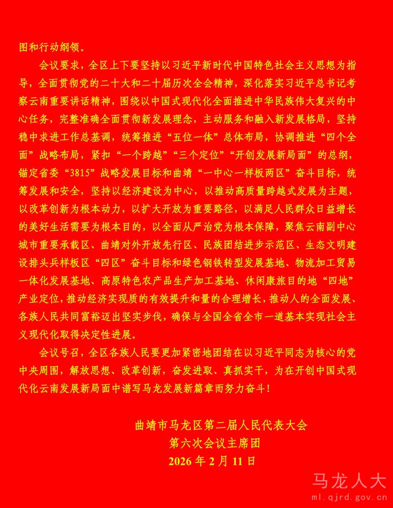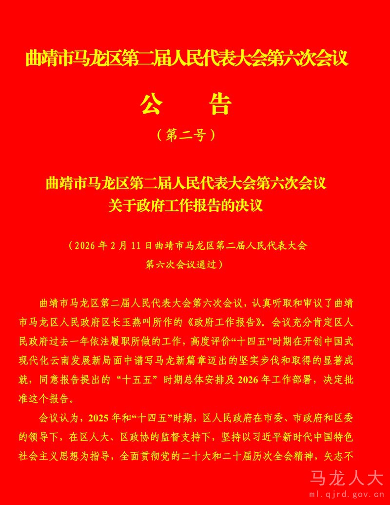 曲靖市马龙区第二届人民代表大会第六次会议公告(第二号)