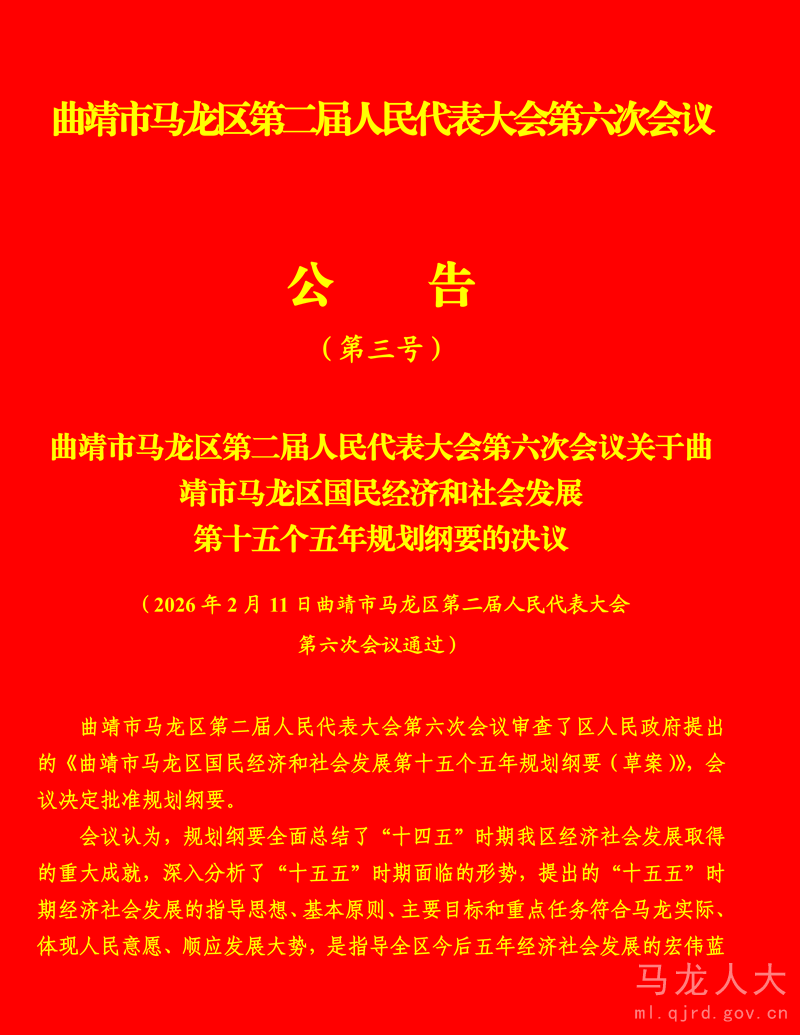 曲靖市马龙区第二届人民代表大会第六次会议公告(第三号)