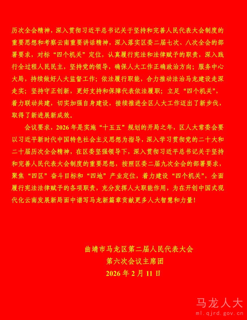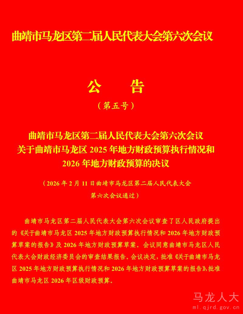 曲靖市马龙区第二届人民代表大会第六次会议公告(第五号)